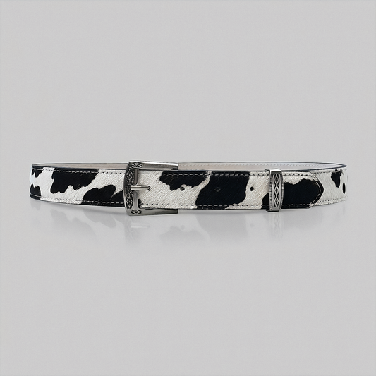 Nossa nova variante do cinto Pampa agora confeccionado em couro de alta qualidade com pelo preto e branco.